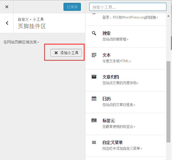 * 頁腳掛件區: 在這裏,必須點擊「添加小部件」,會得到不同的部件列表。點擊任何一個,並將其添加到網站面腳的小部件列表。